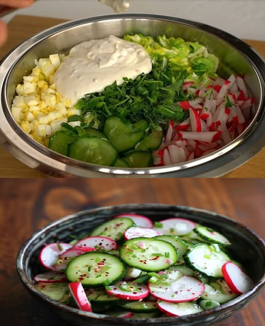 Mieszanie składników: W dużej misce połącz ogórki, rzodkiewki i pokrojone jajka. Dodaj świeży koperek, jeśli go używasz.